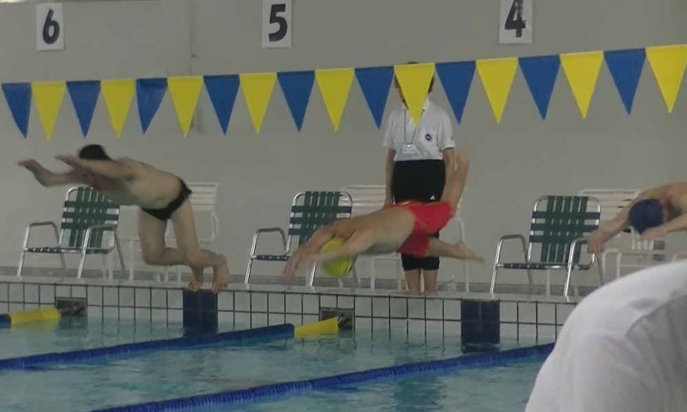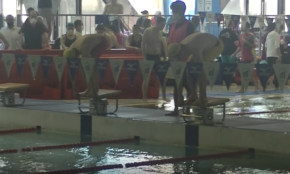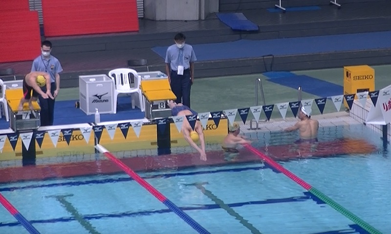 - 泳ぎ終えた萬谷さん、飛び込む佐藤さんとそれを見守る村竹さん