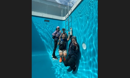 - 鏡のような水面に飛び込む石渡さんがまるでアート作品
